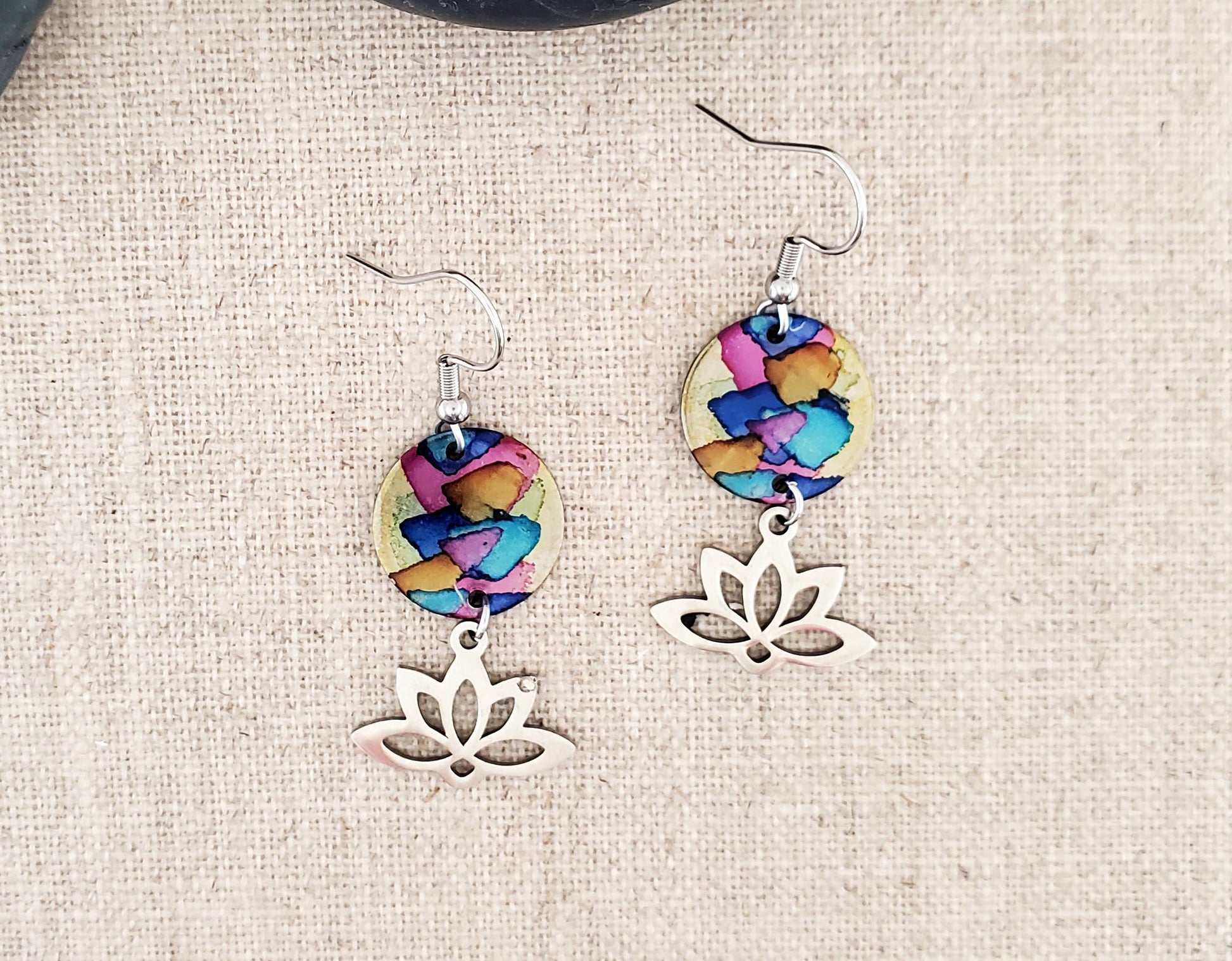 Alcohol Ink Stainless Steel Connector Lotus Earrings