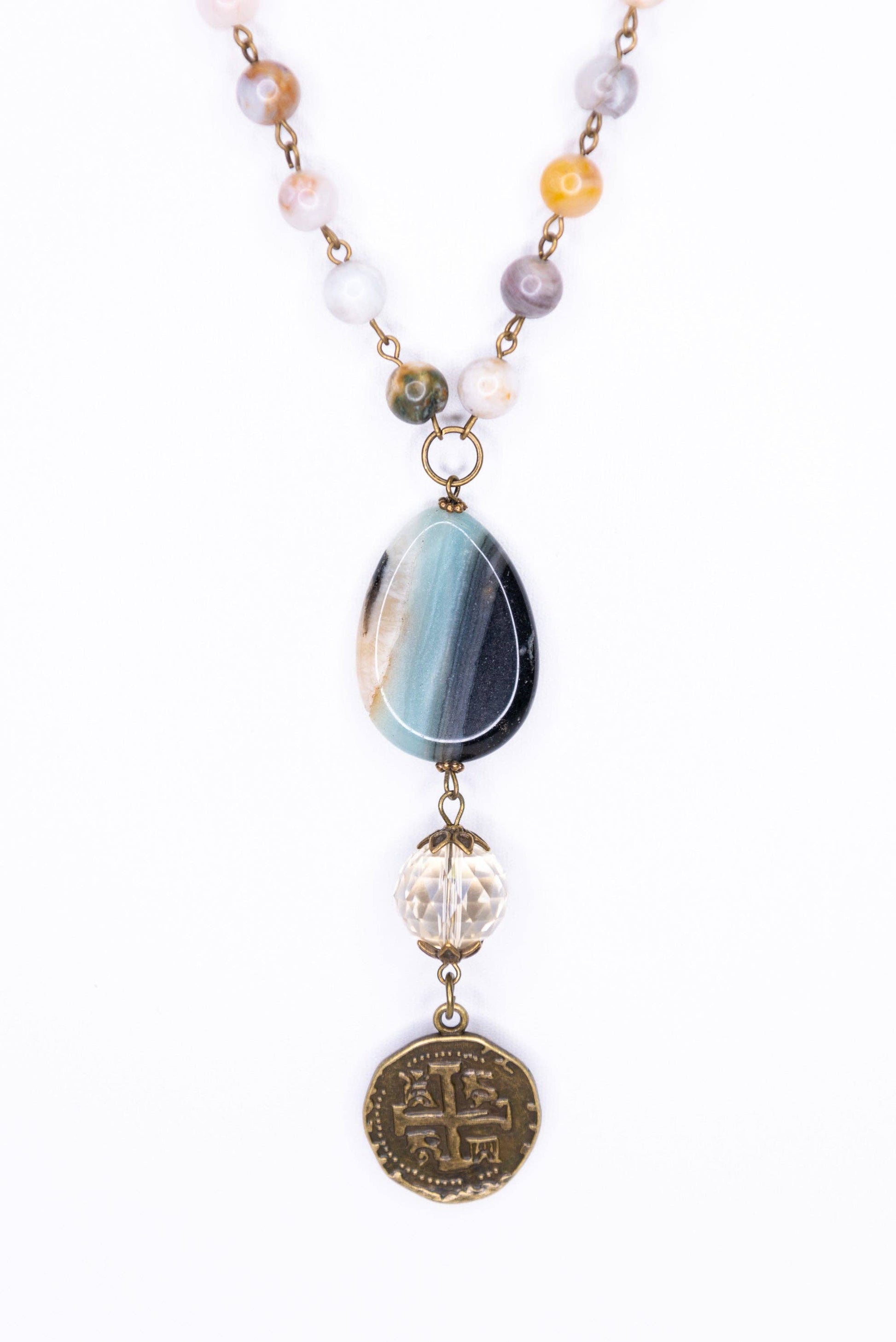 Long, skinny necklace with beautiful natural stones and beads on a chain link. Includes a long charm which includes a doubloon coin, a crystal bead with floral bead ends and a polished agate stone.