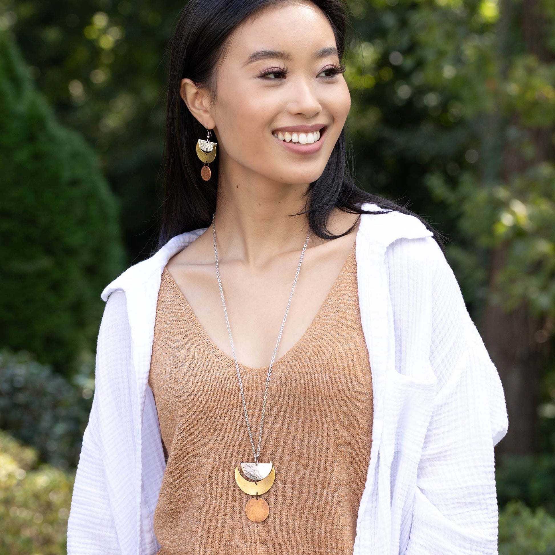 Crafted with meticulous precision, the abstract design features a fusion of hammered metals, including copper, brass, and copper, intricately intertwined to form a captivating and unique composition. The varying textures and tones of the metals lend a dynamic and edgy appeal to the necklace, making it a standout statement piece. Size: 30" Long