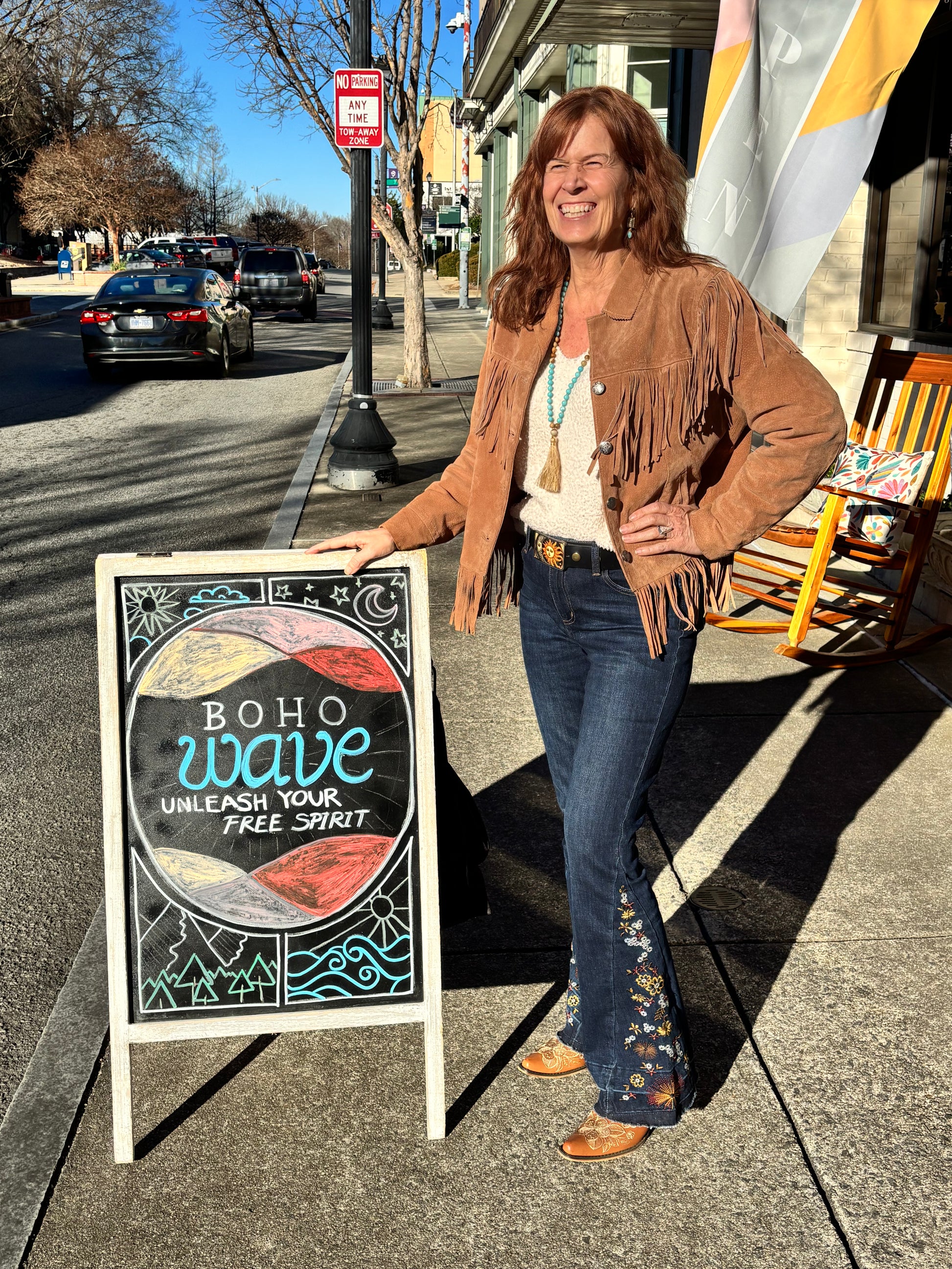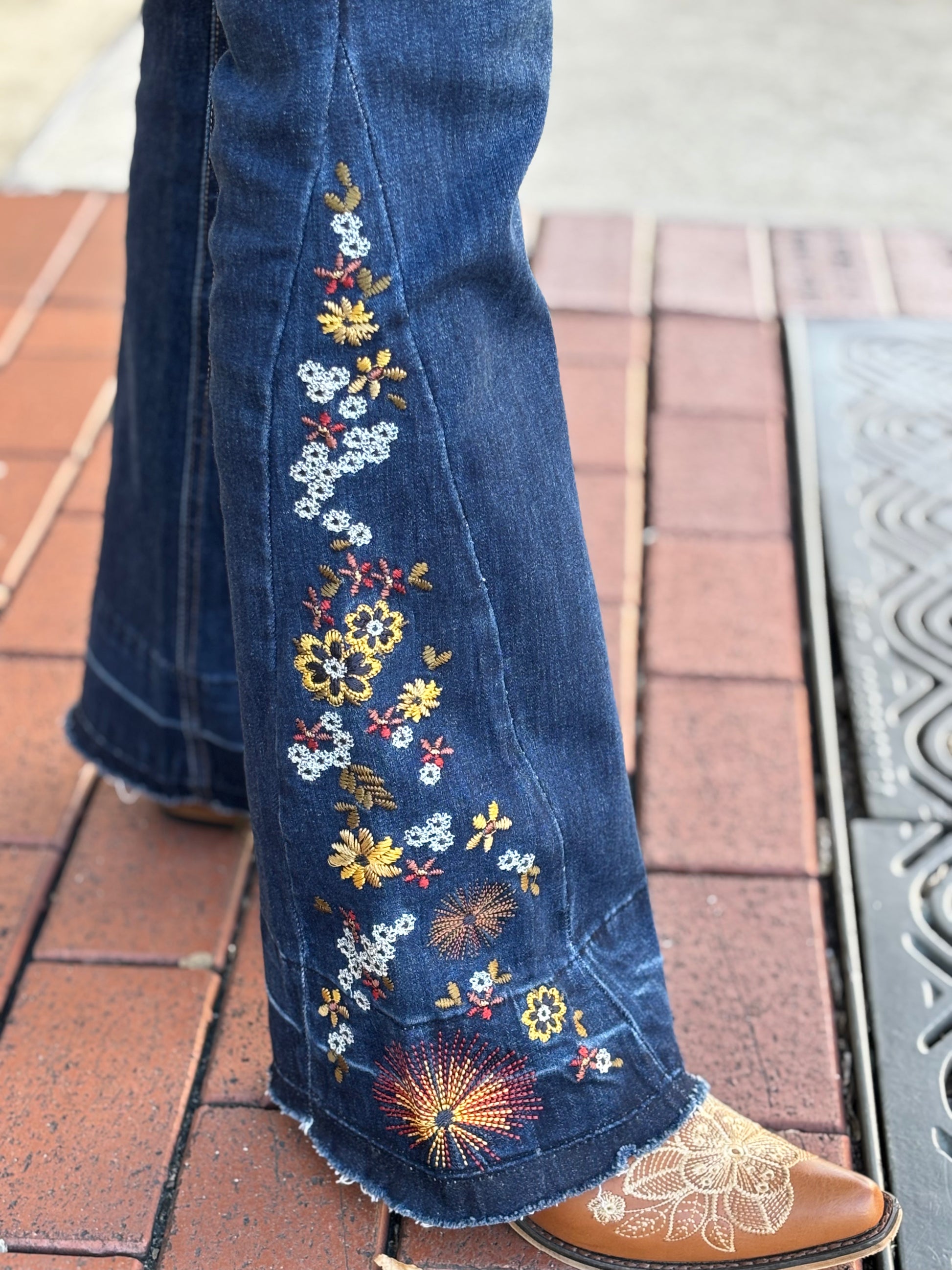 “Sun-washed blue denim with a softly released hem, blooming with delicate floral embroidery at the edge. Designed with a flattering 10” rise, easy 32” inseam, and a relaxed 19” leg opening—crafted in a soulful blend of cotton, recycled fibers, smooth rayon, and a touch of stretch for wander-ready comfort.” 🌸👖✨