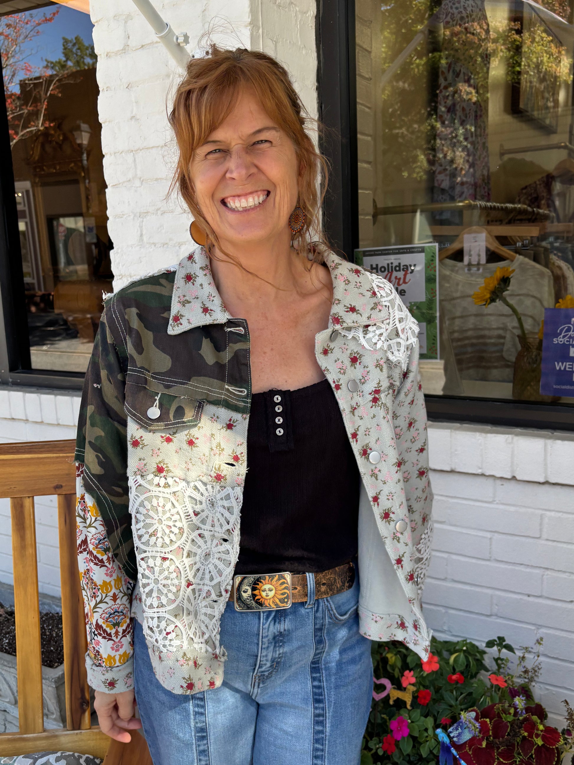 Turn heads and tell your style story with this beautifully eclectic Camo Floral Patchwork Jacket — a true statement piece for the free-spirited soul. Crafted from soft, breathable 100% cotton French terry, this relaxed-fit jacket blends romantic floral prints with unexpected camo contrasts and intricate crochet detailing, creating a rich tapestry of texture and personality.