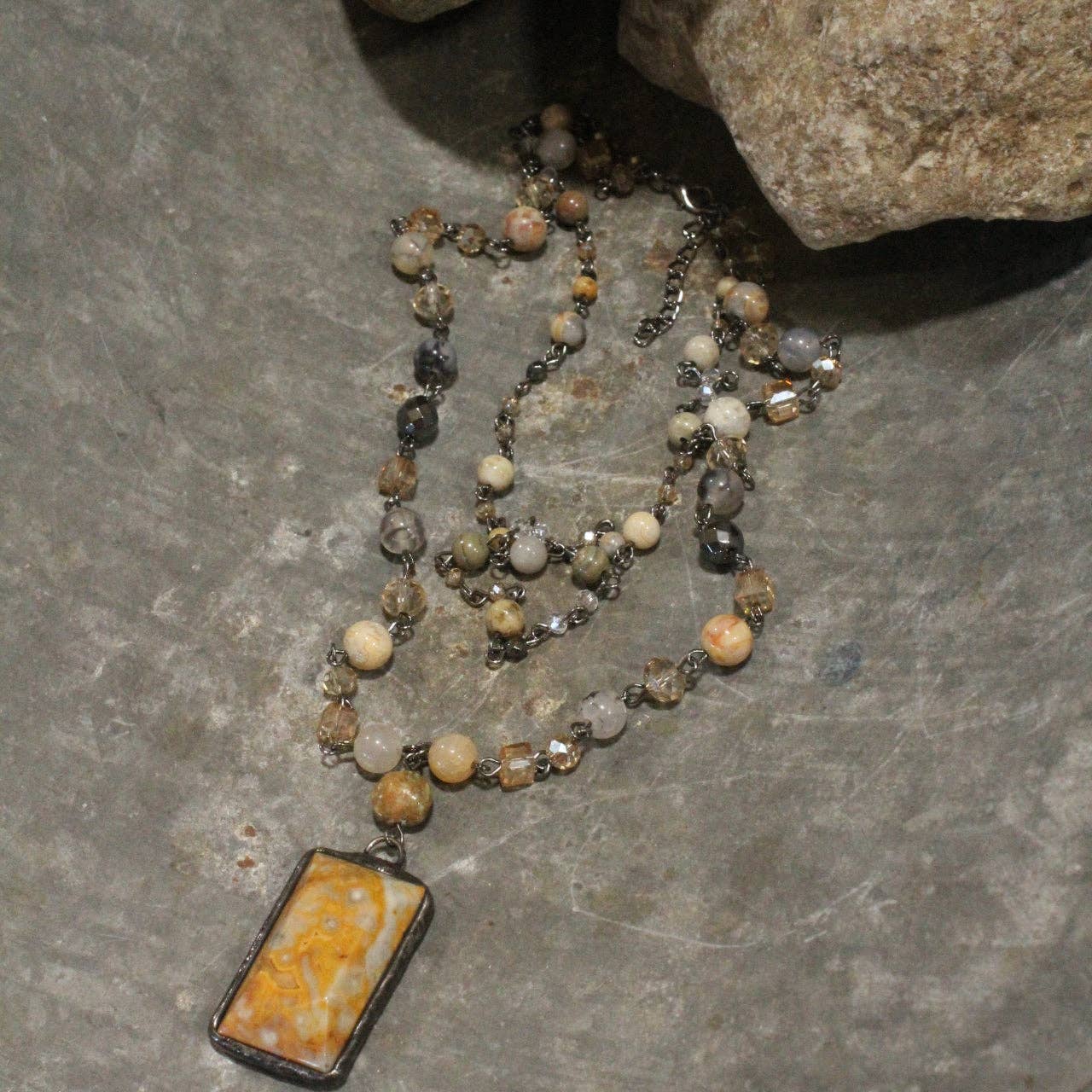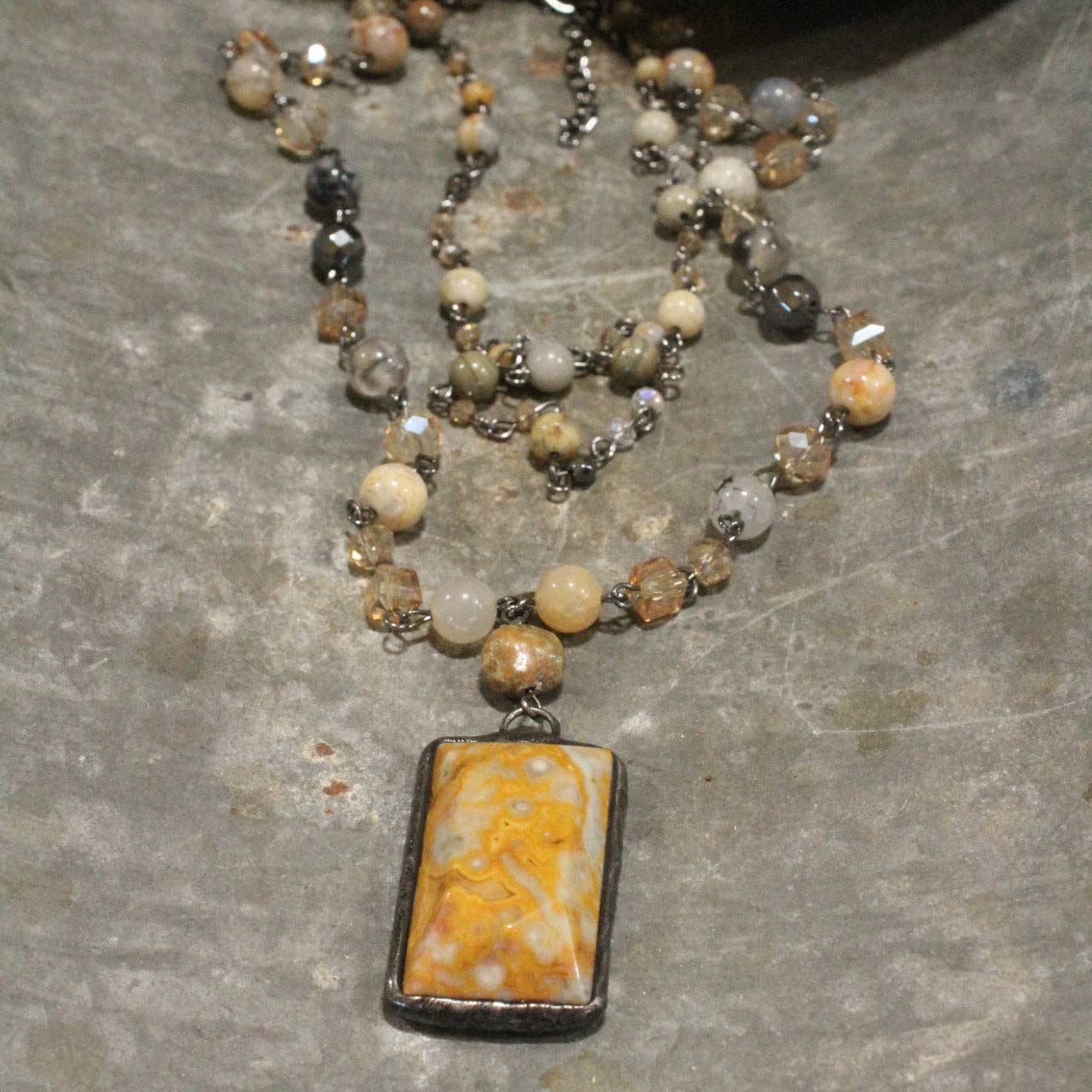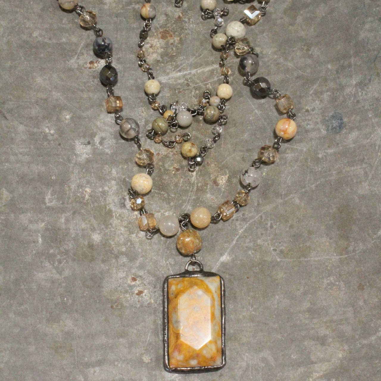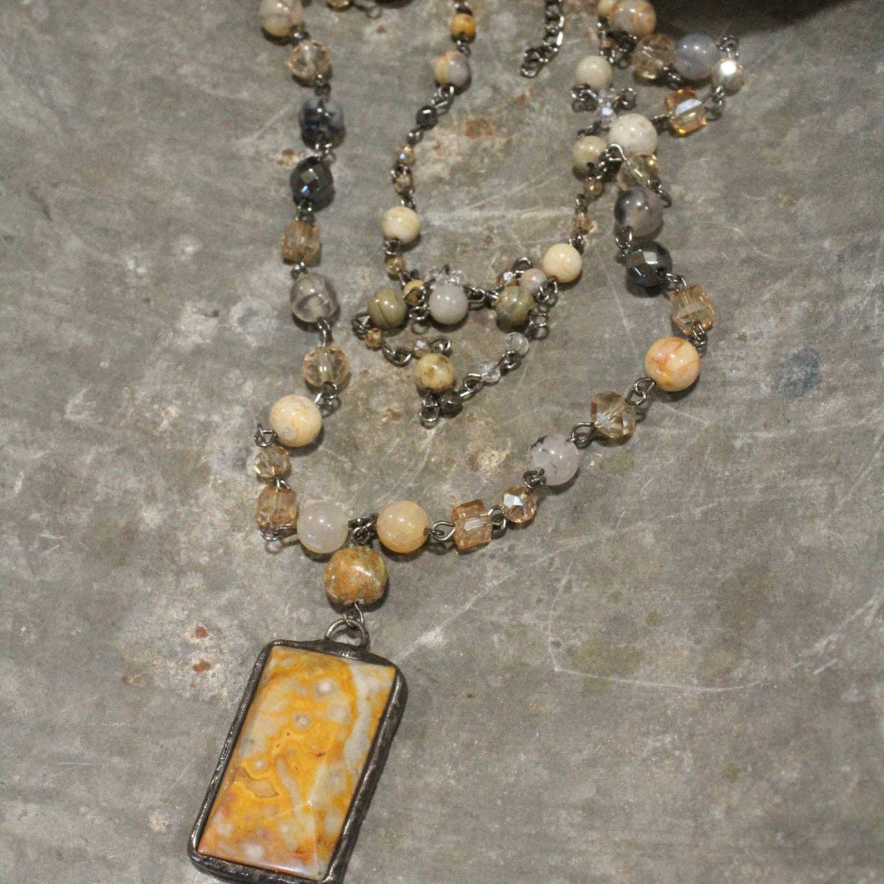 Our ONE-OF-A-KIND jewelry is handcrafted & created just for YOU. We carefully handpick our stones & findings to ensure that each Collection allows you to elevate your wardrobe & express your unique style; whether your reserved, bold, or daring we have something for you to show off your personality. Our designs are created with vintage Czech beads, textured Picasso beads, crystals, natural stones; which includes: amazonite, topaz, apatite, aventurine, quartz, fossil, jasper, jade, howlite, hematite, lapis lazuli, turquoise, magnesite, & more. To top off these designs, each piece will be touched with a mixture of nickel, gunmetal, bronze, silver, & copper, metals. Our pieces can definitely take your ordinary outfit to extraordinary! * Layered chains: 20" Long, 16" Long w/2" chain extension, 2" pendant drop * Due to the individually handcrafted nature of these pieces, some natural stones & multi-colored beads can vary in color & size.