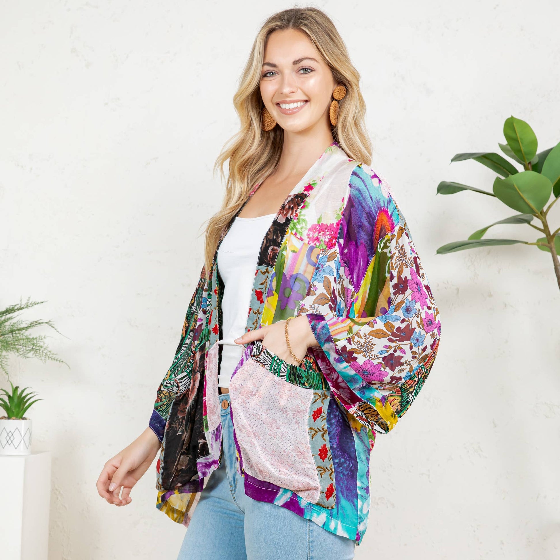 Embrace a touch of Western charm with our Western Patchwork Kimono Top from Young Threads. This captivating top combines the relaxed silhouette of a kimono with the vibrant allure of overdyed mix-match patches in georgette prints, creating a unique and eye-catching piece.