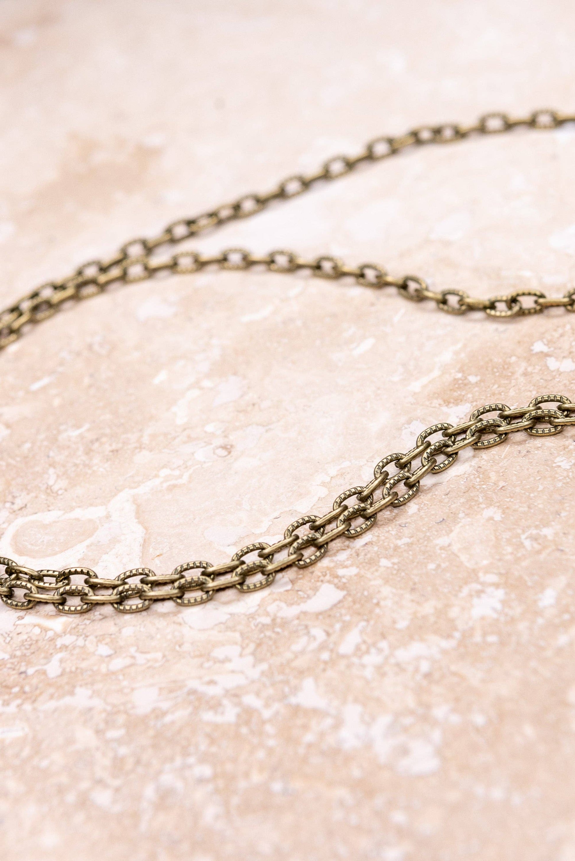 Long, bronze chain link necklace. Drop pendant includes disc-style turquoise round stones, textured bronze ring, and a sliced agate. Lobster claw closure.