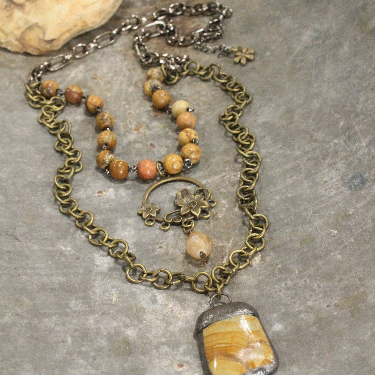 Our ONE-OF-A-KIND jewelry is handcrafted & created just for YOU. We carefully handpick our stones & findings to ensure that each Collection allows you to elevate your wardrobe & express your unique style. Our designs are created with vintage Czech beads, textured Picasso beads, crystals, natural stones; which includes: amazonite, quartz, fossil, jasper, jade, howlite, hematite, lazuli, turquoise, & more. To top off these designs, each piece will be touched with a mixture of nickel, gunmetal, bronze, silver, & copper, metals.