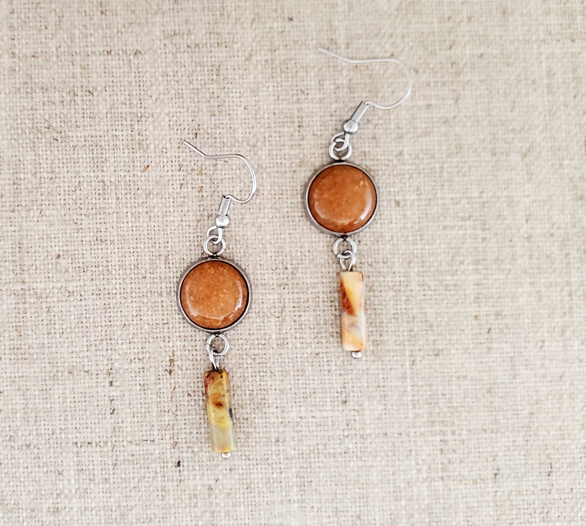 -The earrings are stainless steel with Red Aventurine stone in the connector and Crazy Lace bead as the drop.