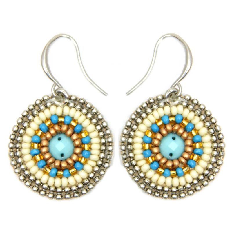 Soan Single Circle Earrings in Caribe DETAILS: Soan single sircle earrings. Appliqued, metal earwire. MATERIALS: Glass seed beads, faux leather, thread, metal hardware. COLORS: Caribe.