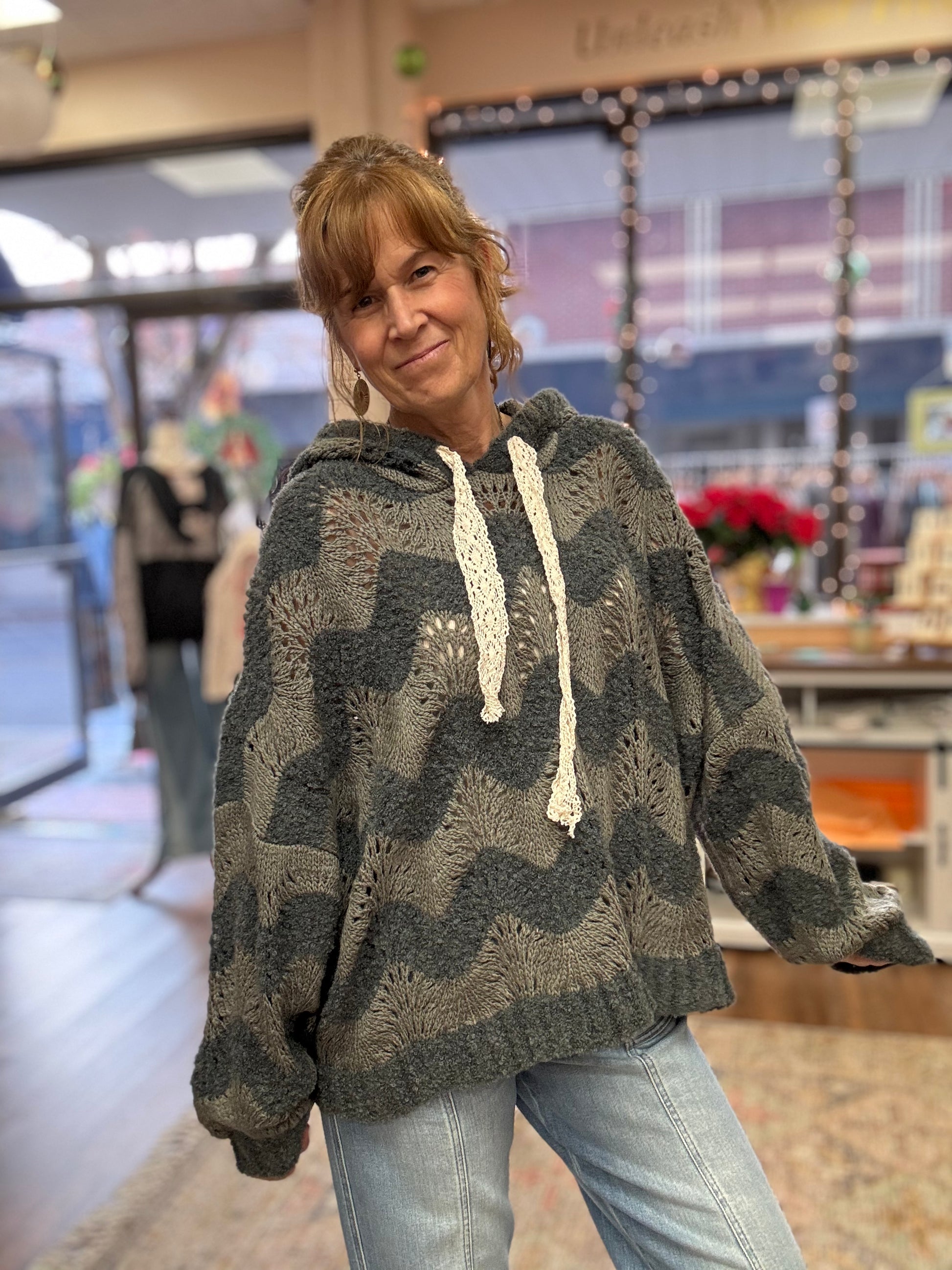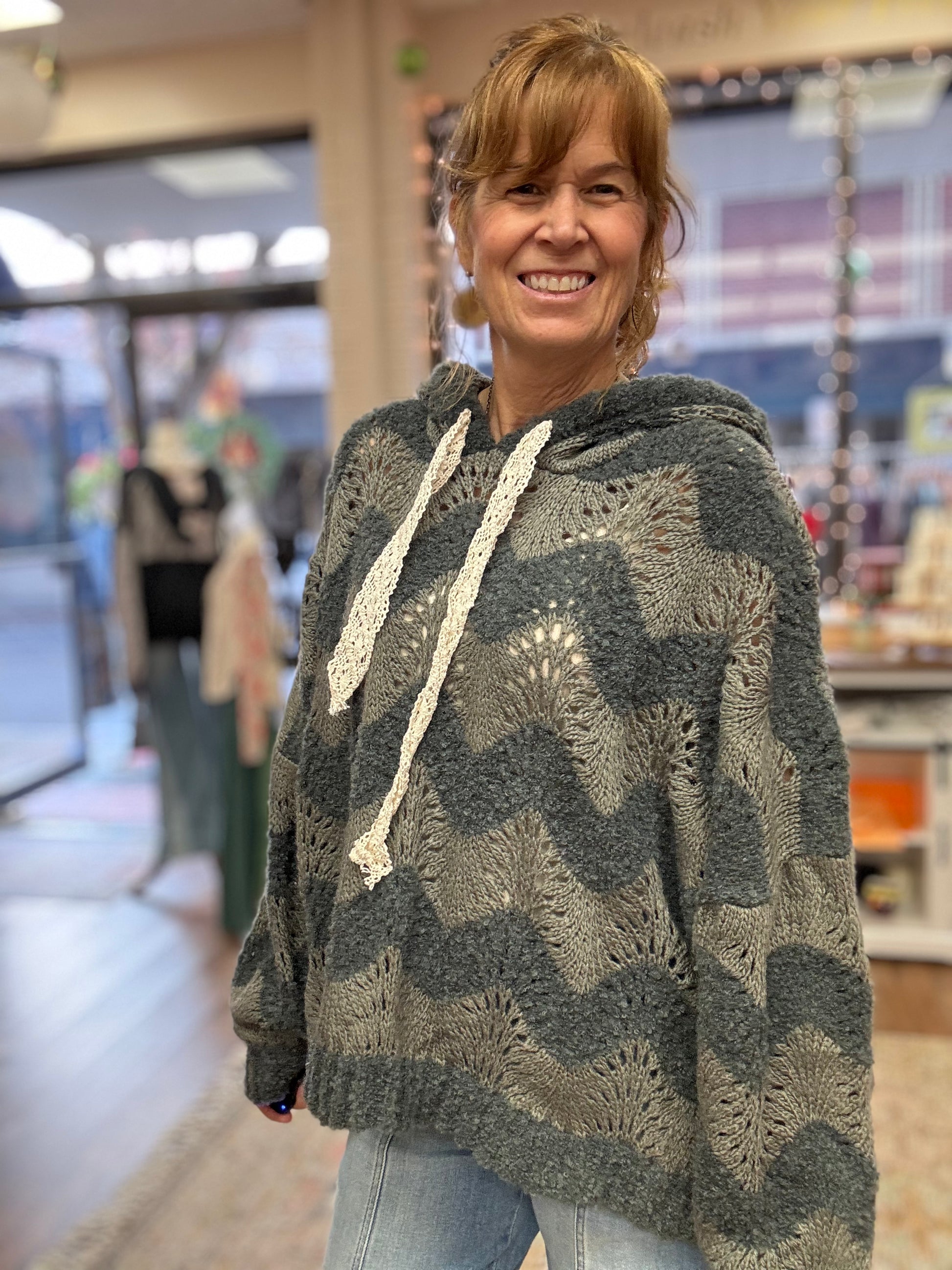 Wrap yourself in the artful embrace of cozy color and carefree charm. This dreamy striped hoodie sweater was made for golden-hour strolls, fireside chats, and crisp autumn wanderings. Handcrafted with a vintage-inspired open-knit chevron design, its balloon sleeves and relaxed, roomy fit create that effortlessly undone silhouette every bohemian heart adores.