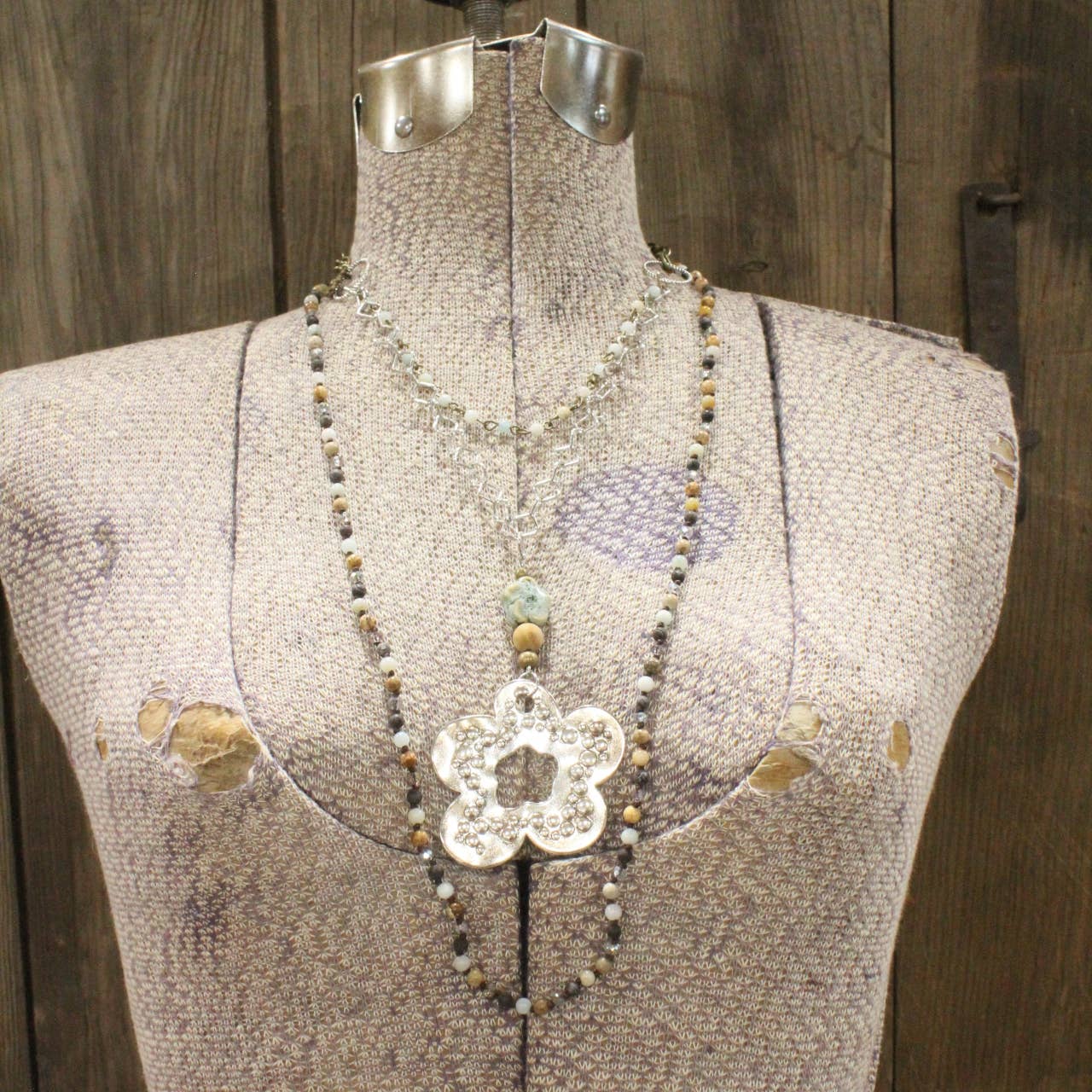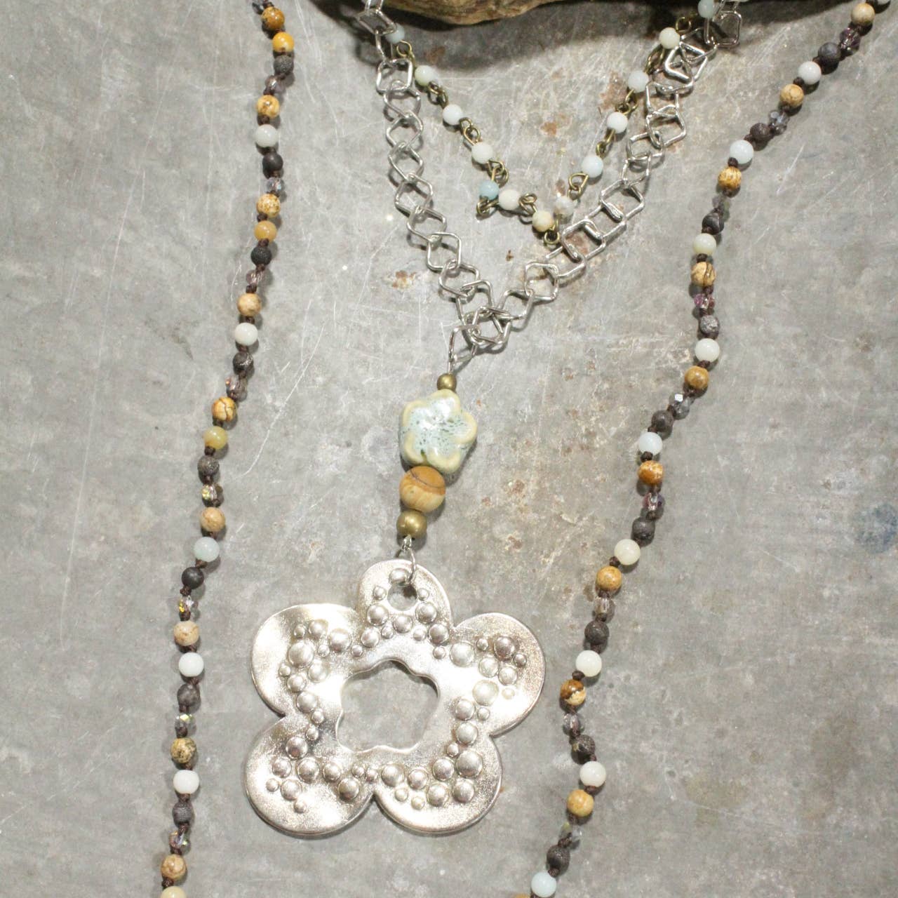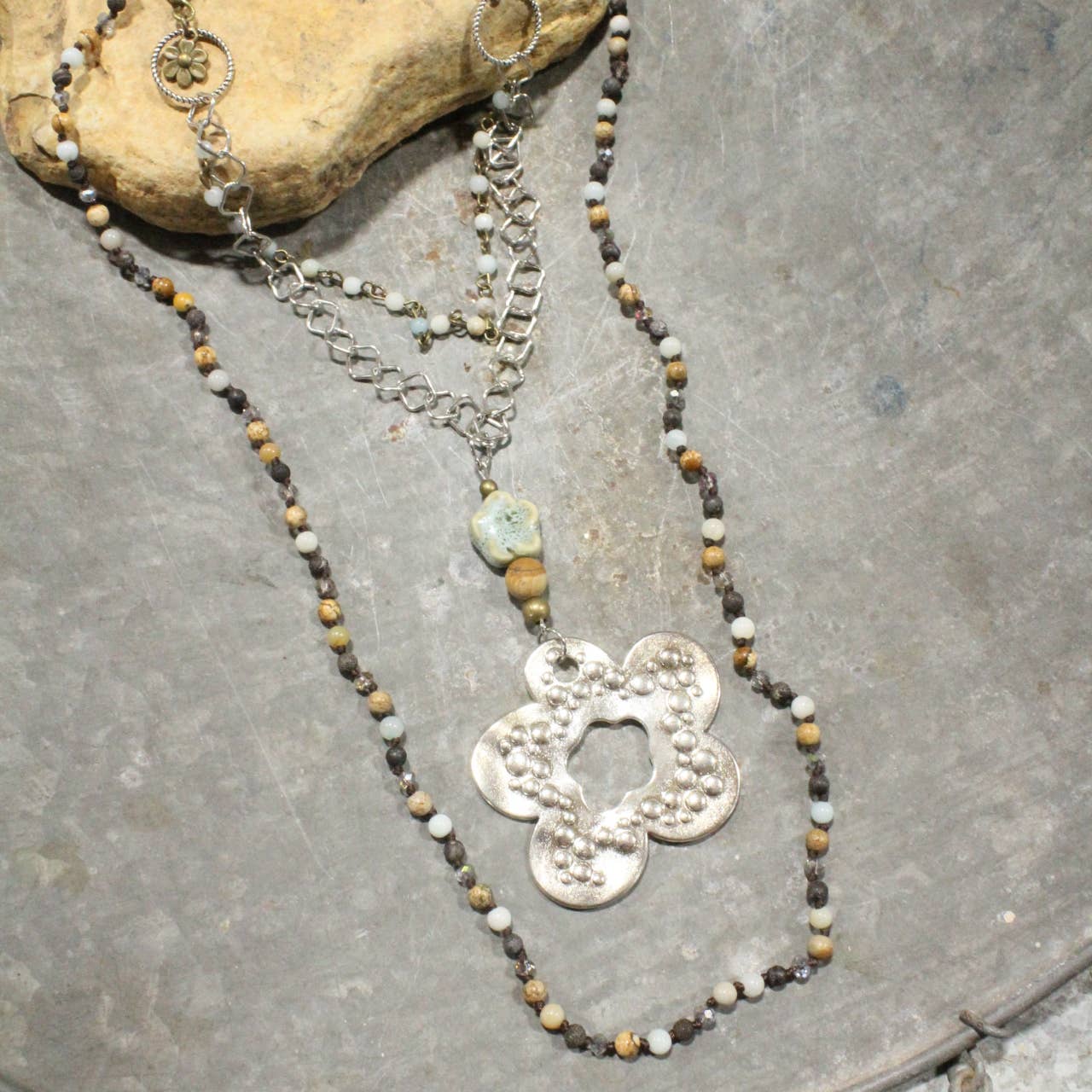 Our ONE-OF-A-KIND jewelry is handcrafted & created just for YOU. We carefully handpick our stones & findings to ensure that each Collection allows you to elevate your wardrobe & express your unique style; whether your reserved, bold, or daring we have something for you to show off your personality. Our designs are created with vintage Czech beads, textured Picasso beads, crystals, natural stones; which includes: amazonite, quartz, fossil, jasper, jade, howlite, hematite, lapis lazuli, turquoise, magnesite, & more. To top off these designs, each piece will be touched with a mixture of nickel, gunmetal, bronze, silver, & copper, metals. 16", 20", & 30" layered lengths with a 3.75" pendant drop