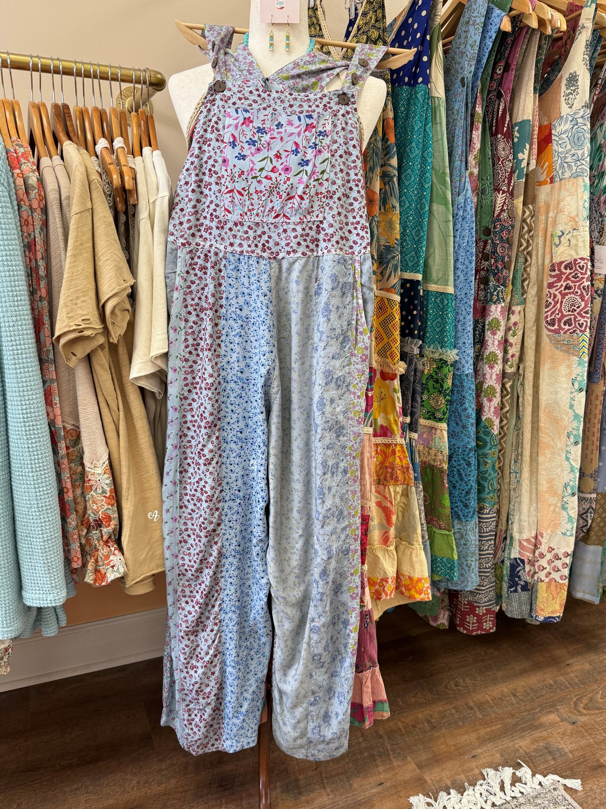 Meet your new boho favorite: the WanderWeave Overalls — a joyful blend of carefree spirit and artisan charm. Crafted from a patchwork of dreamy prints and earthy tones, these lightweight panel overalls are made for the wild-hearted and the wanderers. With adjustable straps, a relaxed fit, and flowy wide legs, they move with you from sun-drenched markets to barefoot beach strolls. Layer over a simple tank or bandeau for an easy, eclectic look.